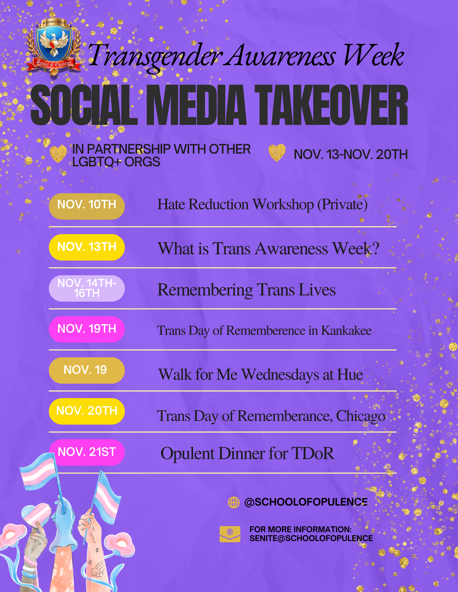 Join us and our partners in honoring Trans Awareness Week and educating our community on the importance of understanding violence, hate crimes, discrimination, and fatal anti-transgender violence. We’re excited to do a digital social media takeover, and host our community for Trans Awareness Week.